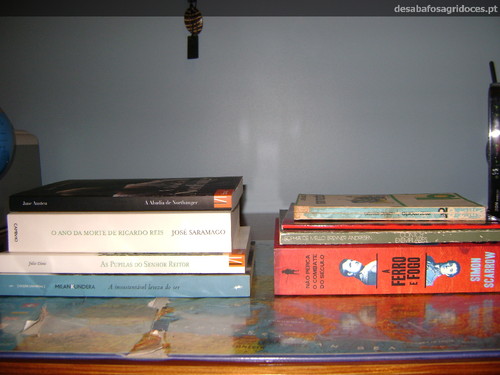 O livro mais caro que chegou à estante este mês foi A Insustentável Leveza do Serde Milan Kundera: comprei-o por 7 euros no Déjà Lú, novíssimo. Através do Segredo dos Livros consegui Daisy Miller de Henry James e Contos Exemplares de Sophia de Mello Breyner. Dei 2,40 pelos dois. A Abadia de Northanger de Jane Austen comprei na Book.it por 4,90. Da Book.it é também o livro As Pupilas do Senhor Reitor de Júlio Dinis. Adquiri-o na promoção grandes clássicos da literatura portuguesa a 1 euro. O Ano da Morte de Ricardo Reis de José Saramago foi uma prendinha. Mar Morto de Jorge Amado comprei no Déjà Lu por 2,10 e A Ferro e Fogo de Simon Scarrow ganhei no blog Conspiração das Letras.