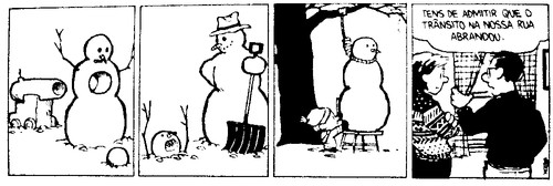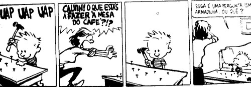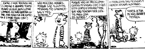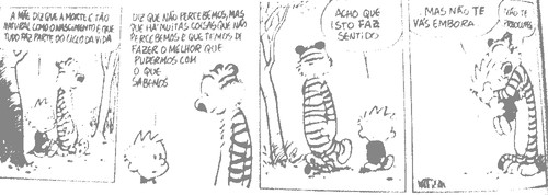 Os livros do calvin and hobbes foram muito possivelmente as primeiras coisas mais a sério que li. Quando me deram o primeiro acho que ainda nem sabia ler direito, devia ter uns seis anos...As aventuras deste puto levado da breca e do seu tigre de peluche acompanharam as minhas primeiras incursões nas letras e acabaram por acompanhar muito mais fases. Nunca me consegui desfazer dos livros apesar de já estarem em bastante mau estado, alguns já perderem as folhas outros a capa...Quando o dia está a correr mal vou á estante e folhei-os e apesar da passagem do tempo continuo a deliciar-me com o cinismo mas também a ternura daquelas tiras e a reparar em coisas que até então me tinham escapado...Thanks, Mr. Watterson! Algumas das minhas tiras favoritas: