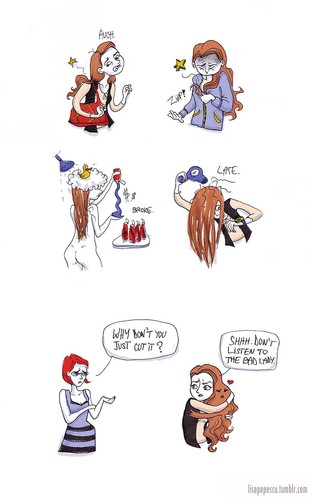 O cabelo vai-me para cara quando está vento ou simplesmente quando me viro; enfia-se na comida; prende-se nos fones; demora uma dolorosa eternidade a pentear e a escova fica num estado medonho; faz calor; elásticos meu Deus não há uma porcaria de um elástico nesta casa; precisa de ser alisado coisa inglória de fazer quando há humidade ou pior: quando começa a chover assim que acabo; sai daí que me estás a me pisar o cabelo; não consigo beber água da torneira nem dar banhos de dez minutos...E no entanto assim que a cabeleireira se aproxima com uma tesoura salto logo da cadeira e coloco-me em posição de defesa - Não se atreva a tocar-me com isso ouviu bem?!! Ele até nem está tão grande assim, talvez o deixe crescer um pouco mais. Escusado será dizer que toda a gente se mostra céptica perante esta decisão, mas não quero saber...Meu precioso cabelinho, não vamos dar ouvidos ás pessoas más.
