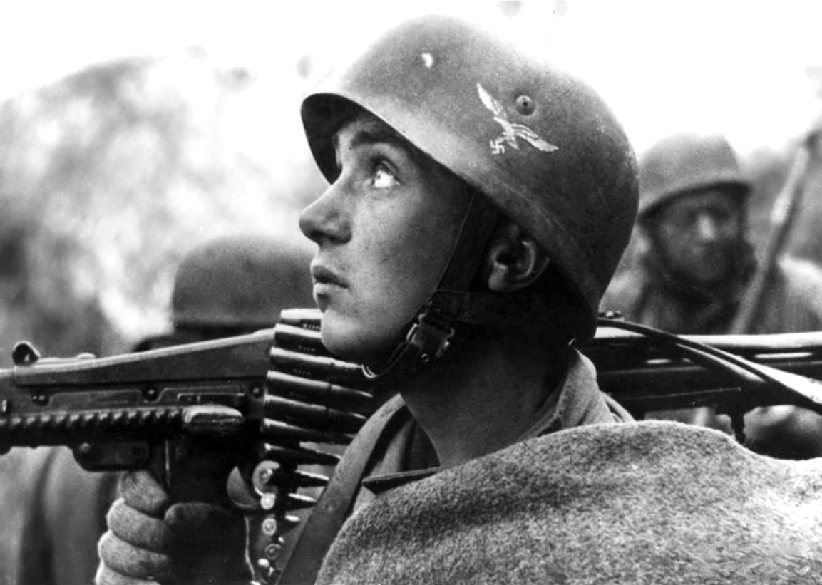 (Soldado alemão da divisão de paraquedistas a ver o que se passa no céu, Itália. Janeiro de 1944)
